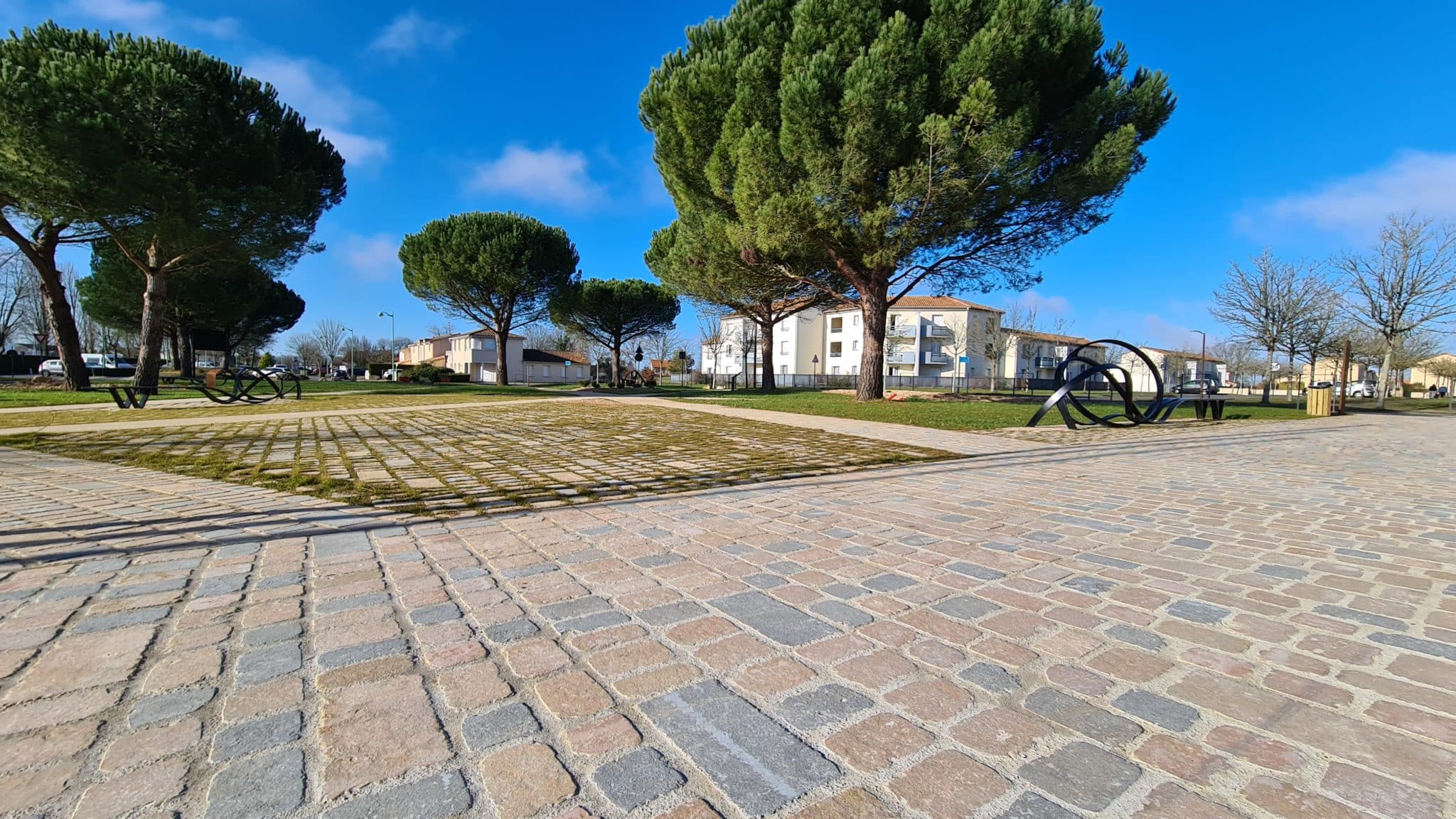 À Fontaine-le-Comte, le projet a misé sur le pavé multicolore Bout du Monde®. Il associe les trois veines colorimétriques (claire, ocre-beige intermédiaire, gris-bleu) dans une trame pensée pour dialoguer avec les murs de la mairie, bâtis en pierre Calminia il y a plus de vingt ans.