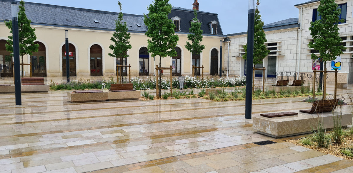 Ainsi le projet de l’esplanade entièrement piétonne, minéralisée et végétalisée a vu le jour. Cet espace comprenant 3 000 m2 de dalles et pavés a été complètement repensé en pôle d’échange multimodal. Pour cela, un travail minutieux a été effectué tant pour la sélection et la fourniture des pierres par CALMINIA® que pour la pose réalisée par EUROVIA.